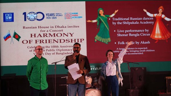 ঢাকার রাশিয়ান হাউস রুশ জনগণের গণ-কূটনীতির ১০০ বছর ও বাংলাদেশের বিজয় দিবস উপলক্ষে এক বর্ণাঢ্য সাংস্কৃতিক কনসার্টের আয়োজন করে। শুক্রবার (৫ ডিসেম্বর) ঢাকার ‘রবীন্দ্র সরোবর’-এ অনুষ্ঠিত এ উৎসবে ১৩ হাজারেরও